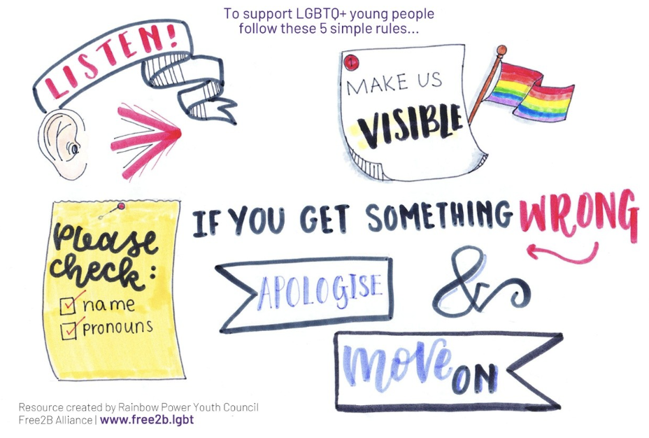 We recommend being decisive about what you want to focus on, don’t aim too high and leverage all your strengths in order to minimise the costs to you. For example, Free2B faced many challenges while enacting systems change work, including the limited capacity of schools. In order to overcome this, they focused on simple, low cost and easy to implement changes that authorities and schools could readily implement without the need for extra funding. They asked LGBTQ young people what were the 5 top things that they would like to get across to schools and professionals. They created this amazing postcard to have as a visual (shown below). This has had measurable change, with schools moving towards gender neutral graphics and making effort to use more inclusive language.